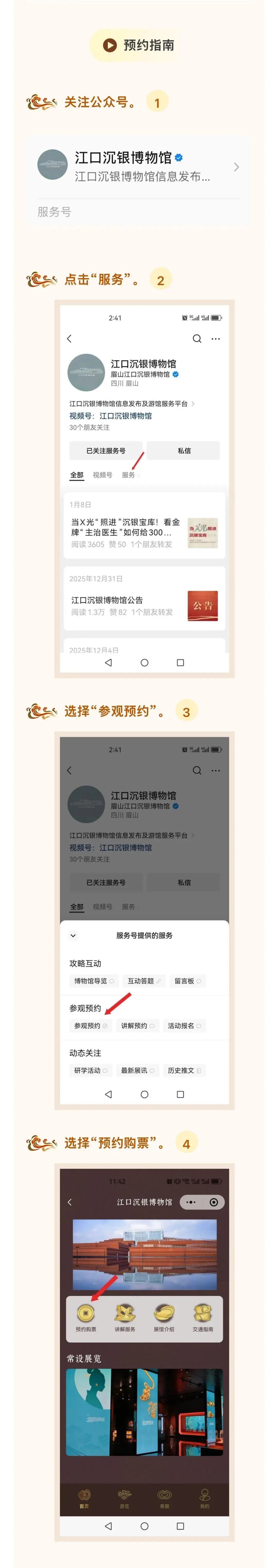 3月6日9:00起通过“江口沉银博物馆”微信公众号实名预约,每日预约名额1000人,约满为止。请凭预约成功的二维码或本人身份证原件,在入口处核验入馆。